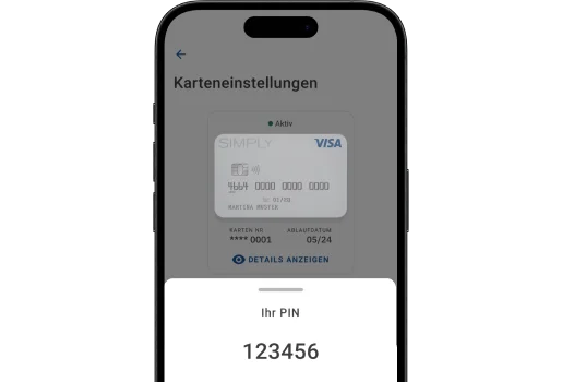 Wählen Sie «PIN» im Abschnitt «Karten» oder in den Einstellungen Ihrer Karte und bestätigen Sie Ihre Identität per Face ID oder Fingerabdruck (oder mit Ihrem Entsperrcode für das Mobiltelefon). Anschliessend wird Ihnen der PIN 30 Sekunden lang angezeigt.
